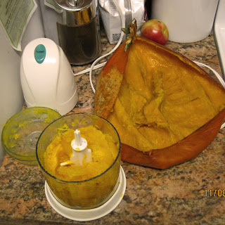 My friend and Allume roommate Rachel, who blogs at Occasional Boredom, is wonderful about finding poorganic recipes and strategies. She LOVES pumpkin and is constantly posting recipes featuring pumpkin puree that DOESN’T come from a can. Since we didn’t carve our pumpkins this year, but rather used “tatoos,” I had three pumpkins with which to make some puree. Here’s Rachel’s instructions on how to make 6 cans worth of puree for only $3.49, using a pumpkin from ALDI.